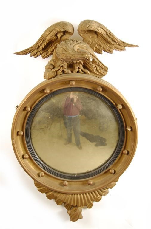 A Regency style giltwood convex mirror, with an ebonised slip to a ball decorated frame with a carved eagle surmount and a leafage base, 19th century, 41.5 x 24.25in (105.2 x 61.5cm). Losses and old repairs..