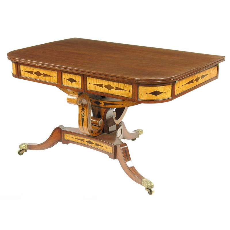 An early 19th century mahogany and bird's eye maple veneered table, the hinged revolving top with rounded corners above a panelled frieze inlaid geometric motifs, on a arched and twin scroll supported base centred a ball finial, the triform base with hipped scroll legs on brass paw sabots and castors, 30.5in (77.5cm) h, 54in (137cm) w, 35in (89cm) d, closed.