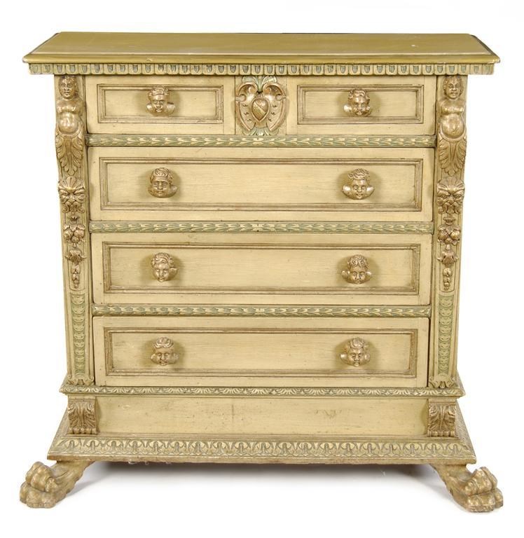 An Italian painted and carved wood chest, with four long drawers flanked by caryatid mouldings, the foliage base on paw feet, 36in (91.5cm) h, 39in (99cm) w, 17in (43cm) d.