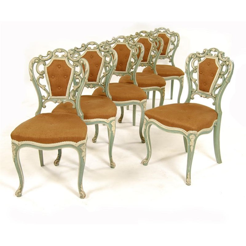 A set of six 19th century carved and painted mahogany side chairs, with part padded backs and stuffed over seats. (6)