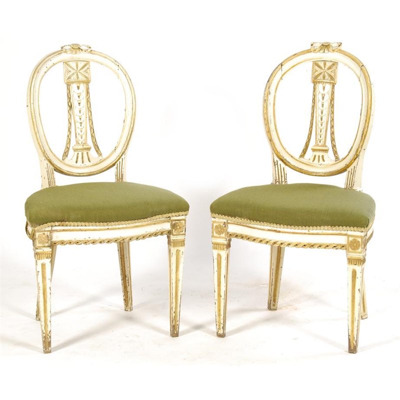 A pair of early 19th century carved wood and painted side chairs, the oval ribbon-tied backs with a tapering splat to later stuffed over seats, one still caned, on square tapering legs. (2) One with wormed back leg.