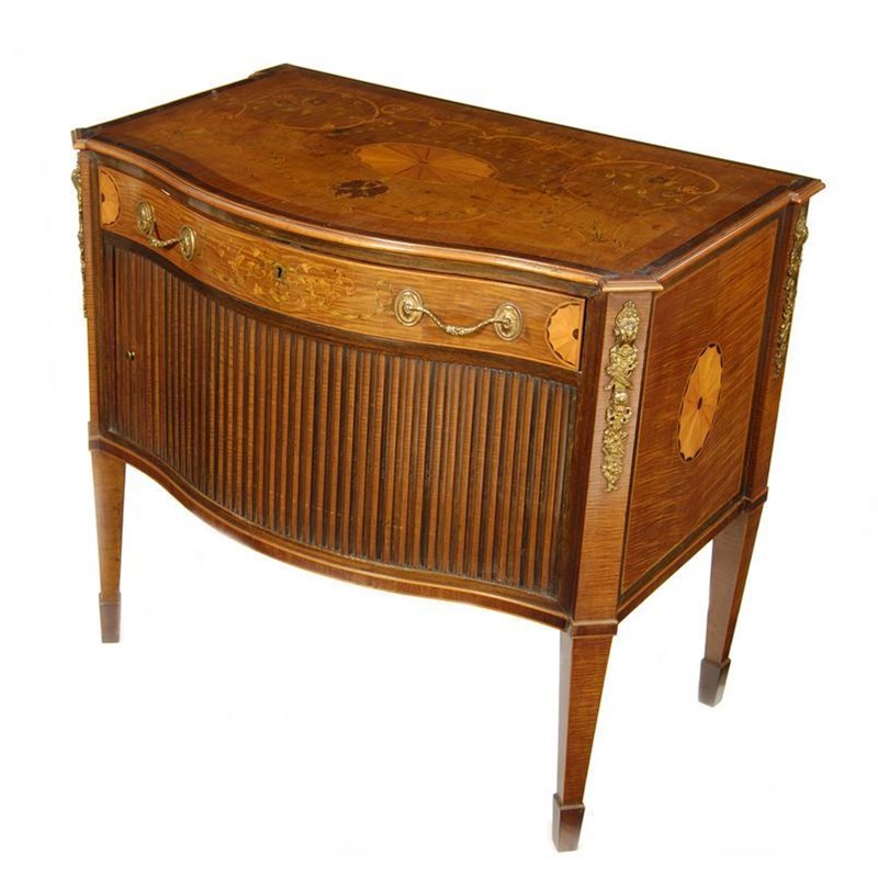A harewood and marquetry serpentine front commode, with gilt metal mounts, inlaid with satinwood fan paterae, scrolls of flowers and foliage, with a frieze drawer above a tambour shutter on square tapering legs to spade feet, probably Dutch 18th century but reconstructed, 32.25in (81.7cm) h, 35.5in (90.2cm) w, 23.25in (59cm) d.