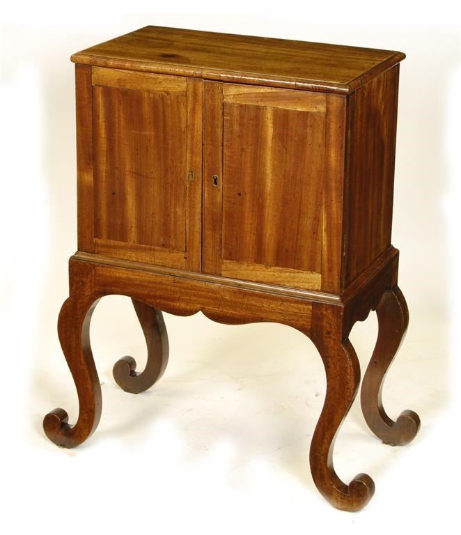 An Anglo-Chinese teak cabinet on stand, the moulded edge top above a pair of doors enclosing ten short drawers, the stand with an arc d'arbelette apron on scroll supports, early 19th century, 30.75in (78cm) h, 26.5in (67.2cm) w, 13in (32.8cm) d.