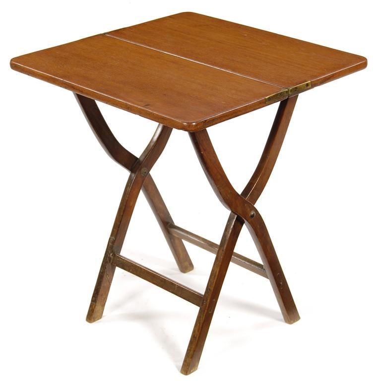 An Anglo-Indian teak and hardwood coaching table, with brass hinges, one leg stamped 'T.P. LUSOS.....ALLAHABAD, 1042,' 25.25in (64cm) h, 22.25in (56cm) w, 21.75in (55cm) d. One leg with metal braces.