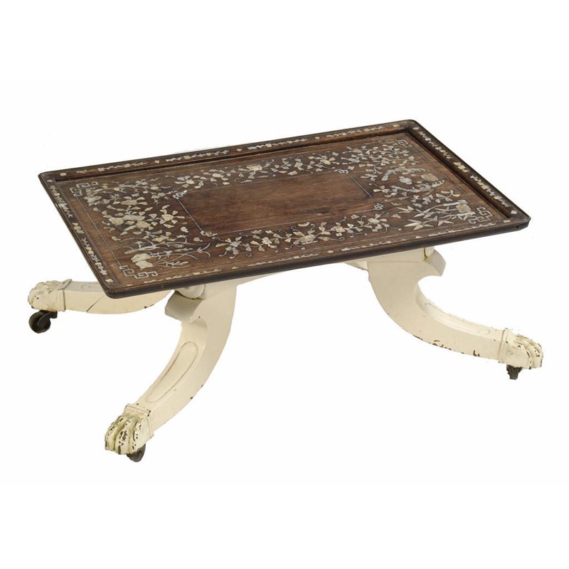 A Chinese rosewood and mother of pearl marquetry tray, 24.75 x 16.25in (63 x 41cm) on a white painted Regency table base, 10.5in (26.5cm) h.
