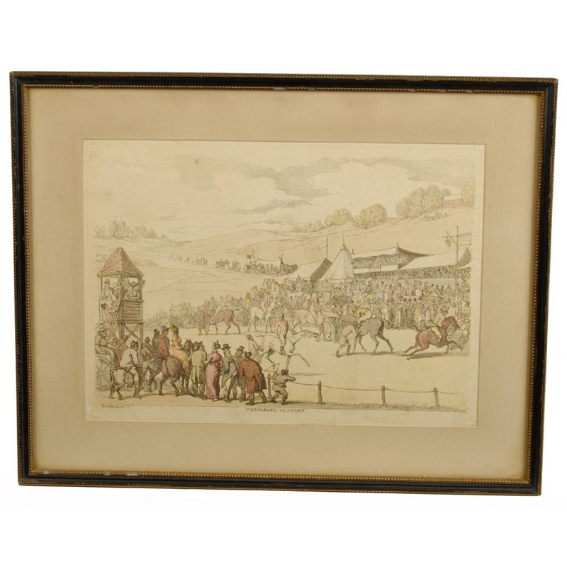 After Thomas Rowlandson. 'Preparing to Start', a coloured engraving, 10 x 14in (25.5 x 35.5cm) and a caricature after James Gillray, 'Integrity Retiring from Office'. (2)
