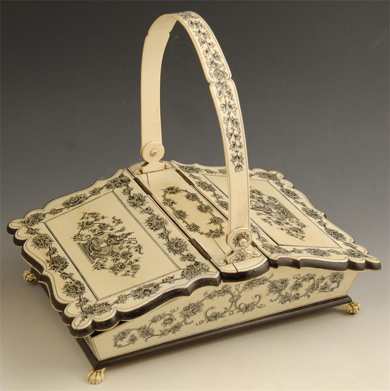 An Indian ivory, sandalwood and horn casket, Vizagapatam, with twin sloping covers painted goddess Lakshmi, Hindu goddess of wealth, to foliage borders and with a central swing handle, the interior with a pierced division on carved paw feet, 12.75in (32.5cm) w, 9.5in (24cm) d. Cracks to ivory and lids warped.