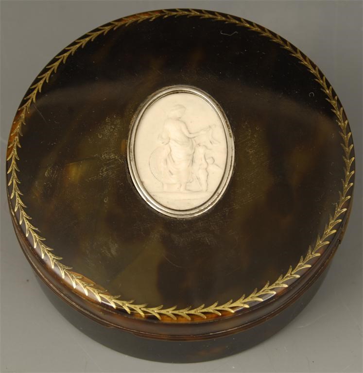 An early 19th century tortoiseshell circular box and cover, with a pique feather border and inset an oval plaque, relief decorated St Catherine, 3.25in (8cm) dia. Cover edge repaired.