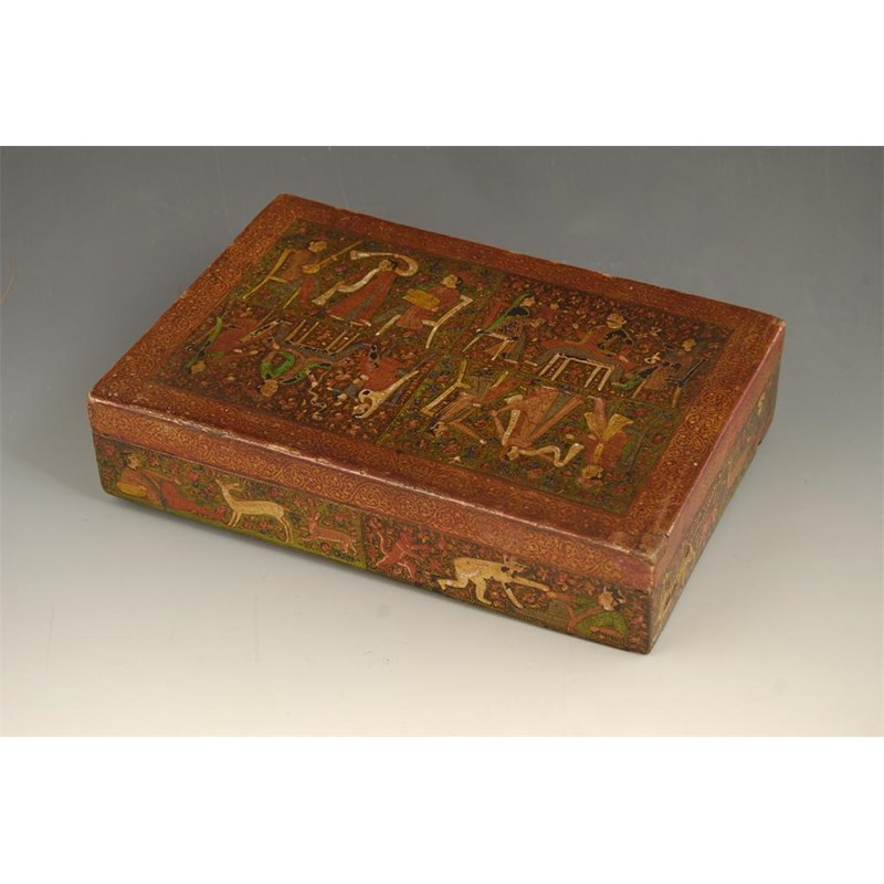 An Indian painted rectangular box and cover, the top quartered and decorated figures playing music, snake charming, and courtship, the sides with further figures and animals, 2.5in (6cm) h, 10in (15.5cm) w.