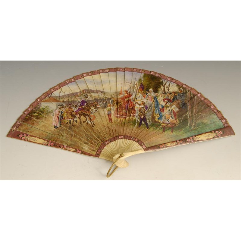 A painted ivory fan, painted an historical scene of mounted figures outside the walls of a city, the reverse painted a river landscape, 12.5in (32cm) w, in a J. Duvelleroy case.