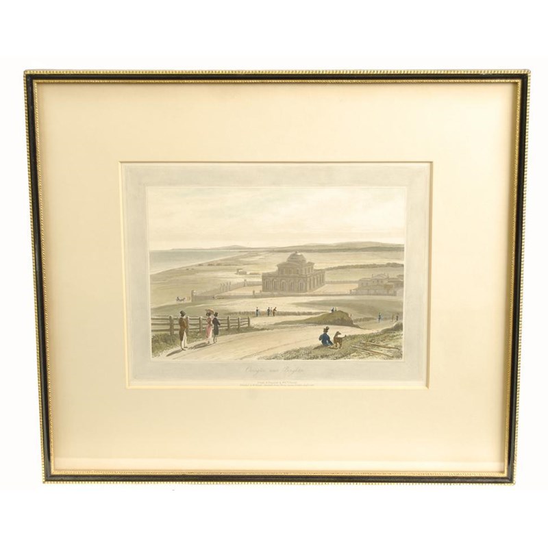 After William Daniel. 'Ovington near Brighton', a hand coloured aquatint, 8.25 x 11in (21 x 28cm), two other views of Brighton including the pavillion after Pugin, an aquatint after J. Moore, lake view near Rangoon, and a reproduction map, the South East coast of England. (5)