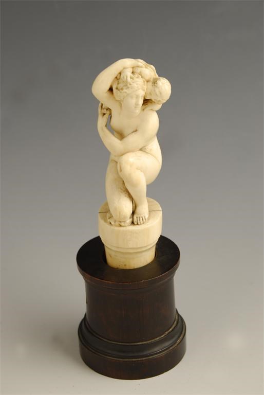 A French carved ivory group, of The Crouching Venus with Cupid on her shoulders, on an oval column, 4.5in (11.5cm) h, with a turned stained wood stand.