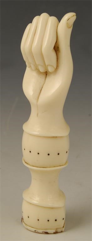 A 19th century French carved ivory seal, modelled as a clenched fist, the matrix inscribed 'A.T.' 3.75in (9.5cm) l. Cracks.