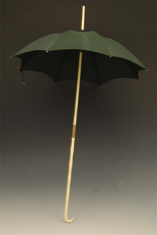 An ivory handled and green silk parasol, the folding handle with a brass collar and a scroll terminal, 29.5in (75cm) l.