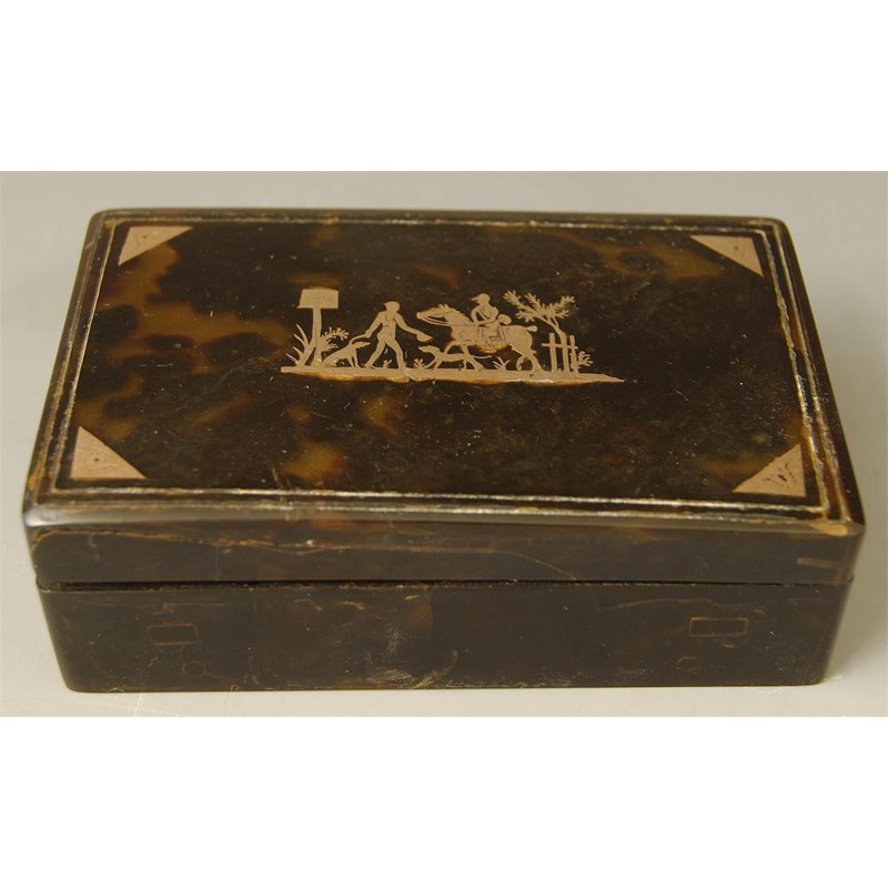 A 19th century continental tortoiseshell and pique box, the cover with a hunting scene, 3.75in (9.5cn) w. Repairs, previously with musical movement.