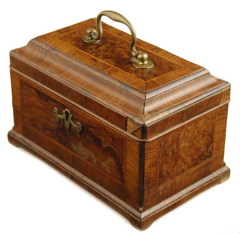 A mid 18th century walnut tea caddy, burr veneered, cross and feather banded with caddy moulded edges, the interior with a pair of tole lidded canisters flanking a recess and with a concave spoon rest, 6in (15cm) h, 9.25in (23.5cm) w, 5.75in (14.5cm) d. Some patches and losses of veneer, left base return moulding missing.