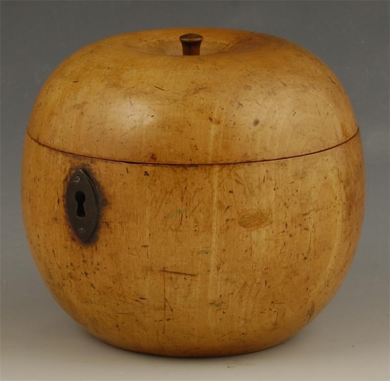 A fruitwood tea caddy, in the form of an apple, the interior with traces of foil, 3.75in (9.5cm) h. Old damage around the hinge.