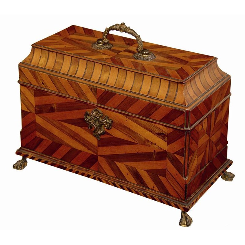 An 18th century German satinwood and kingwood parquetry tea caddy, with a moulded edge and a hinged cover with a cast gilt brass handle, revealing a triple divided interior above a cedar lined side drawer with a button release, the moulded edge base on gilt brass claw and ball feet, 8in (20.5cm) h, 11.5in (20.9cm) w.