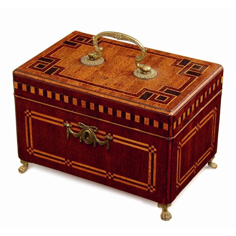 A mid 18th century Dutch mahogany tea caddy, with a moulded edge and parquetry banding, the hinged cover with a cast brass handle to a triple divided interior, the front with a ribbon tied swag escutcheon on brass paw feet, 5.5in (14cm) h, 8in (20cm) w.