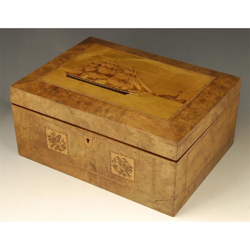 A Victorian walnut and Tunbridge ware box, the hinged lid inlaid a three masted sailing ship with a lighthouse beyond, to a compartmented interior, three with lids, one with a paper label with a handwritten inscription 'Made by B. Stone aboard the Nore light ship Sheerness, Kent, Sept 1877', 6in (14.8cm) h, 13in (33cm) w, 9.75in (24.6cm) d.