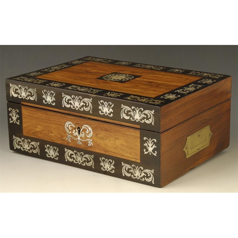 A 19th century kingwood and mother of pearl marquetry box, with sunken brass side carrying handles, 5in (12.5cm) h, 12in (30.5cm) w, 8.5in (21.5cm) d. Restored.