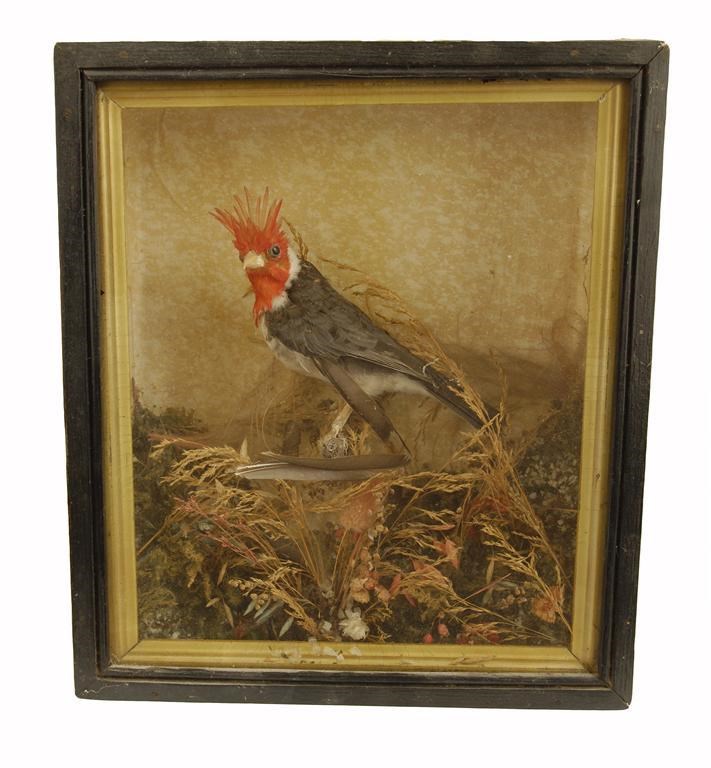 A cased Red Crested Cardinal, perched on a branch amidst mosses and grasses, 13.75in (35cm) h. The Red Crested Cardinal is native to South America, introduced to Hawaii in the 1930's.