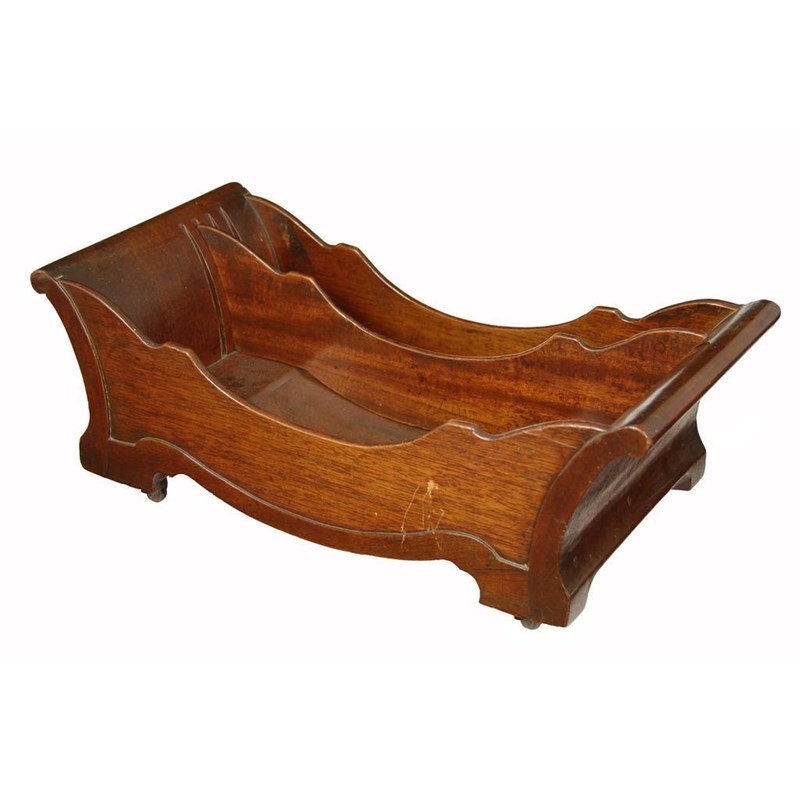 A George III mahogany cheese coaster, with panelled shaped sides and scroll ends, having an adjustable divider and on brass and leather roller castors, 6.5in (16.5cm) h, 17.25in (44cm) w, 9in (23cm) d.