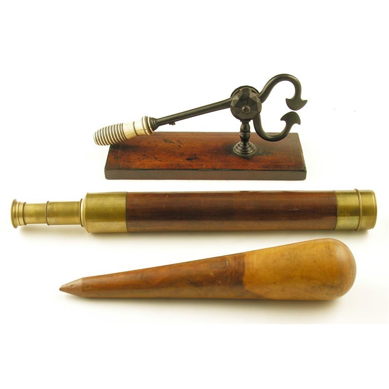 An early 19th century wrought iron sugar cutter, with a turned bone handle on a mahogany base with stringing, 11.5in (29cm) l, a turned lignum vitae fid, stamped W.Clements & Son and arrow, 12in (30.5cm) l, and a brass and mahogany bound two draw telescope. (3)