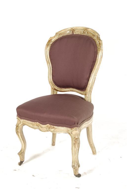 A mid 19th century French side chair, with a carved wood frame painted duck egg blue and off white, having a padded back and stuffed over seat, on horn castors.