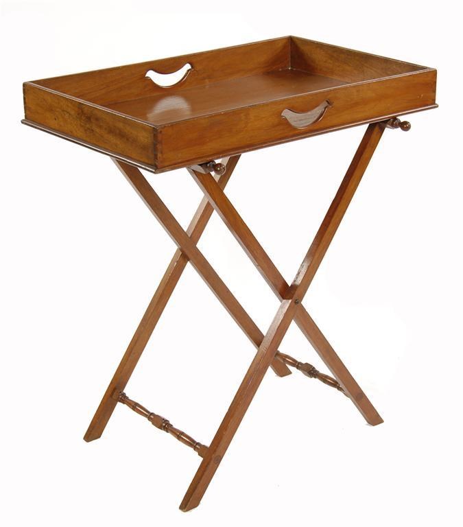 A Victorian mahogany butler's tray on stand, the tray with pierced handgrips, on a folding stand with turned stretchers, 32.25in (82.1cm) h, 28.25in (71.6cm) w, 20.25in (51.2cm) d.