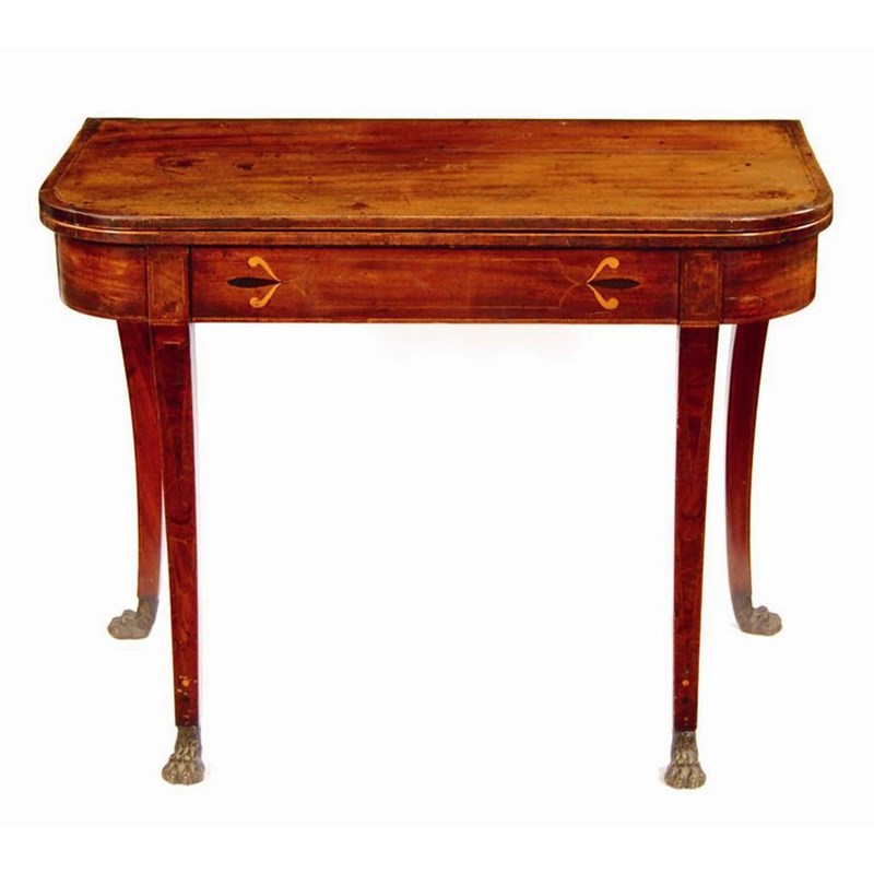 A Regency mahogany card table, inlaid stringing the 'D' shape top above a marquetry frieze on sabre legs terminating on bronze paw feet, formerly on castors, 28in (71.2cm), 36.25in (92cm) w, 17.75in (45cm) d. Cracks to top.