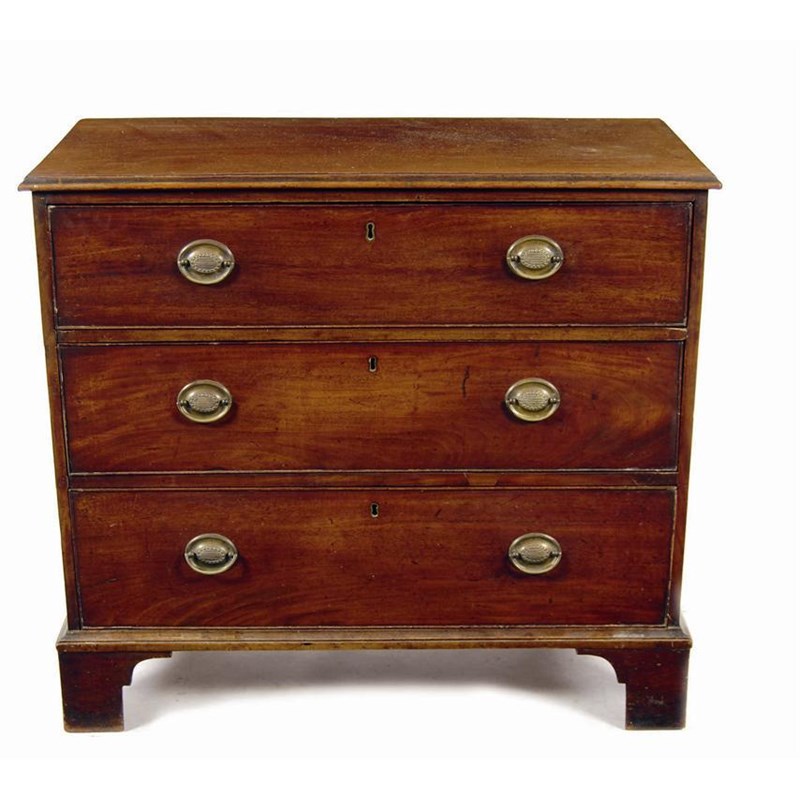 A 19th century mahogany chest, the moulded edge top above three graduated drawers, on bracket feet, with pine sides, 33.75in (85.3cm) h, 37.5in (95.5cm) w, 18.5in (46.7cm) d. Cracks to top.