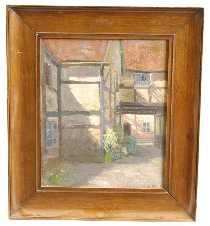 A.M. Ward. A courtyard scene, oil on board, 11.5 x 9.5in (29 x 24cm), and another by the same hand, farmyard scene. (2)