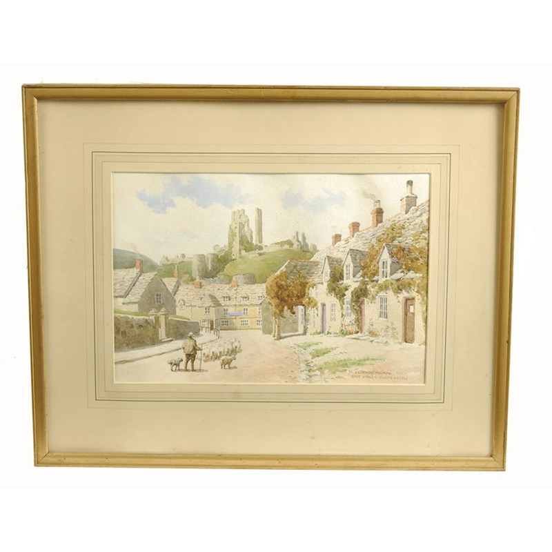 E.C. Pascoe-Holman. 'East Street, Corfe Castle', watercolour, 7.75 x 10.75in (19 x 27.5cm), and another watercolour by A.Tanner, continental lake scene, 6 x 9in (15 x23cm). (2)