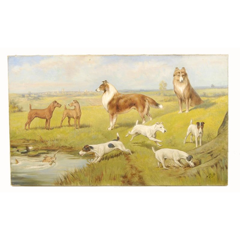 P.J Bayzand. Dogs by a pond, an oil on canvas, signed with initials, 18 x 30in (45.7 x 76.2cm).