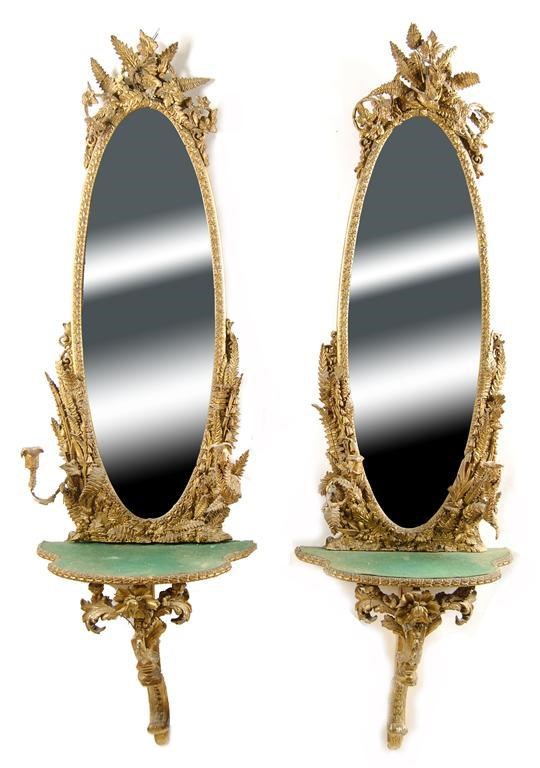 A pair of 19th century giltwood girandoles, each with an oval bevelled plate to a frame carved with ferns, bell flowers and scrolling foliage, with a bird surmount and twin candle holders, 44.5 x 16.5in (113 x 42cm). (2) Old damages, losses and restoration.¦
