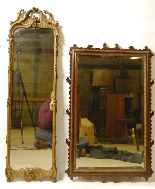 A 19th century giltwood and gesso pier mirror, with foliage and scroll decoration, 42 x 12.5in (106.5 x 32cm) various losses, and a late Victorian rectangular wall mirror with a bevelled plate and a mahogany fret border, 34 x 22in (86.5 x 56cm), losses. (2)