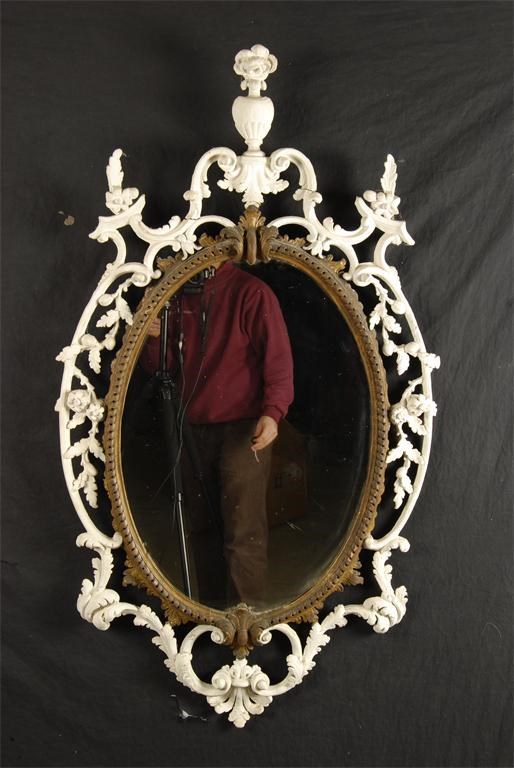 A carved giltwood and white painted mirror, the oval plate to a guilloche moulded edge to a pierced outer frame carved with flowers and foliage, with an urn surmount, 18th century and later, 48.5 x 27in (123.2 x 68.5cm). Damages.