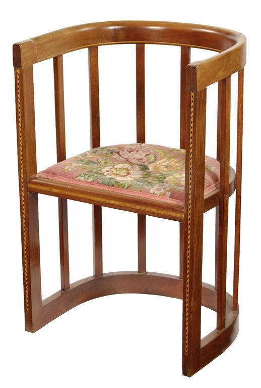 An Arts and Crafts mahogany tub chair, with stringing and chequer banding having a needlework seat.