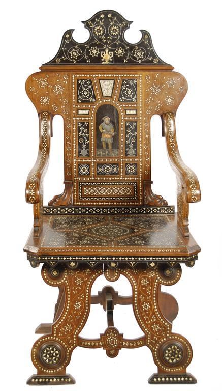 A late 19th century Italian walnut and ebonised open armchair, with pewter and bone marquetry and parquetry, the shaped back centred a soldier flanked by flowering urns, the base with paw feet, to a tapering seat and scroll arms with tassel supports on an open trestle base united by a shaped stretcher.