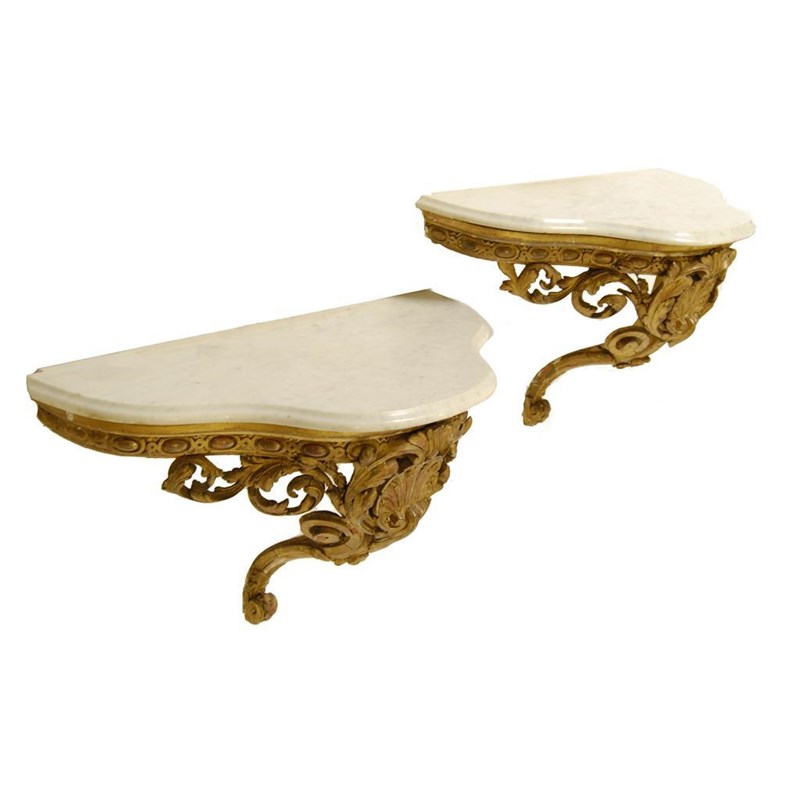 A pair of 19th century giltwood and gesso wall mounted console tables, with serpentine white marble tops above a central shell with pierced scrolling foliage on a single scroll support, 17.75in (45cm) h, 29in (73.5cm) w, 14in (35.5cm) d. (2)