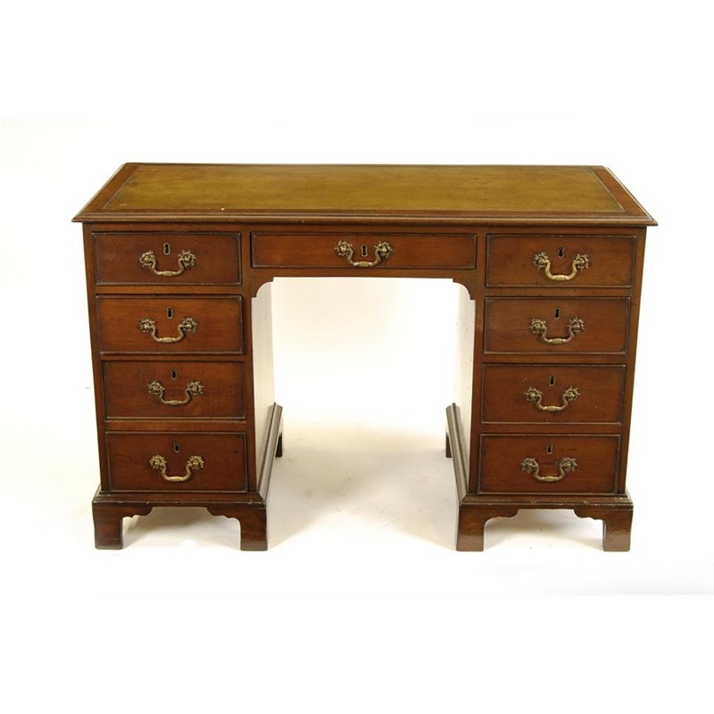 A mahogany twin pedestal desk, the moulded edge top inset green leather above three frieze drawers and three drawers to each pedestal, on bracket feet, 30in (76cm) h, 46.5in (118.2cm) w, 22.5in (57cm) d.