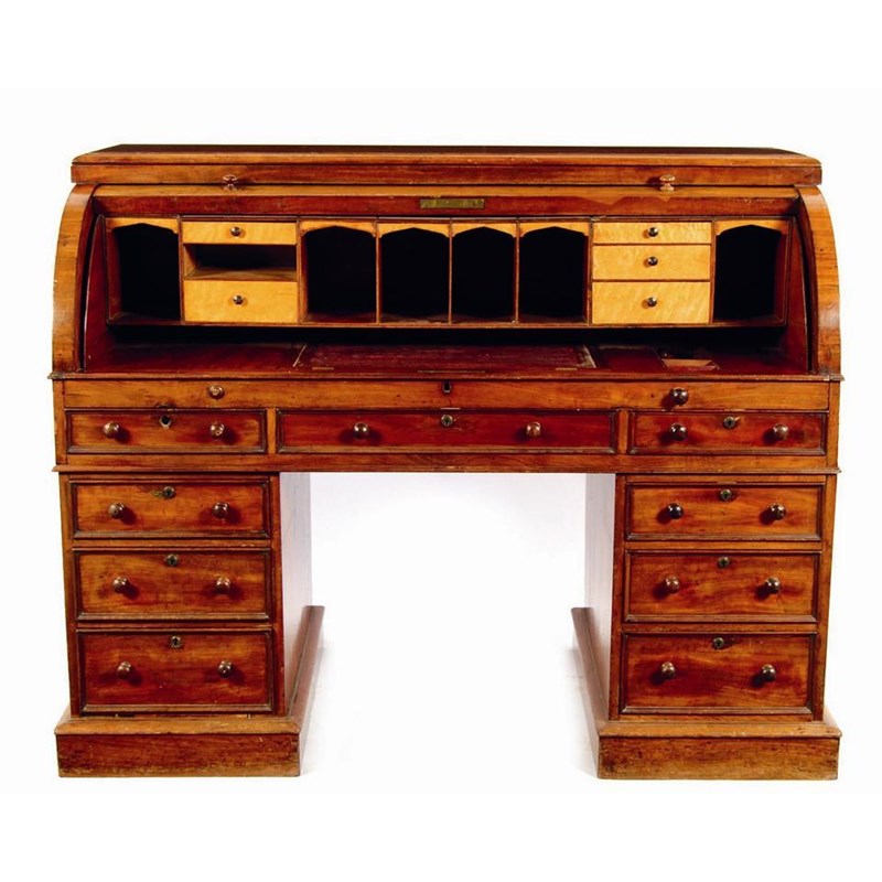 An early Victorian mahogany twin pedestal cylinder desk, with a bird's eye maple veneered interior with pull-out slide having a ratcheted slope and open compartments, with a brass lock stamped 'Mordan & Co Maker's', cut, above eight drawers, the central frieze drawer stamped 'W. Priest, 17 & 24 Water St, Black Friars', 45.5in (115.5cm) h, 58.5in (148.5cm) w, 30.5in (77.5cm) d. ¦