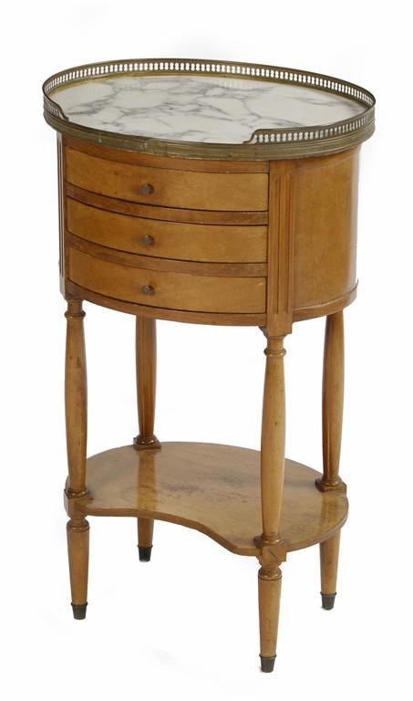 A French mahogany oval table ambulante, with a pierced brass gallery and marble top above three drawers, 29in (73.6cm) h, 16.75in (42.7cm) w, 13.5in (34.2cm) d.