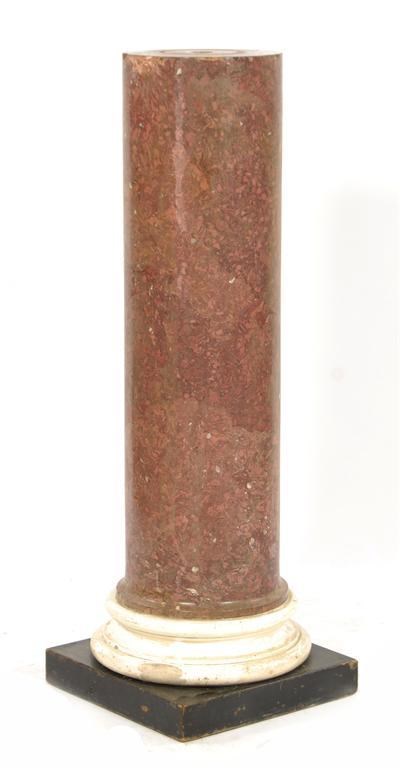 A scagliola column, imitating marmo rosso, on a socle base and an ebonised square plinth, 42.5in (108.2cm) h, 15in (37.7cm) w.