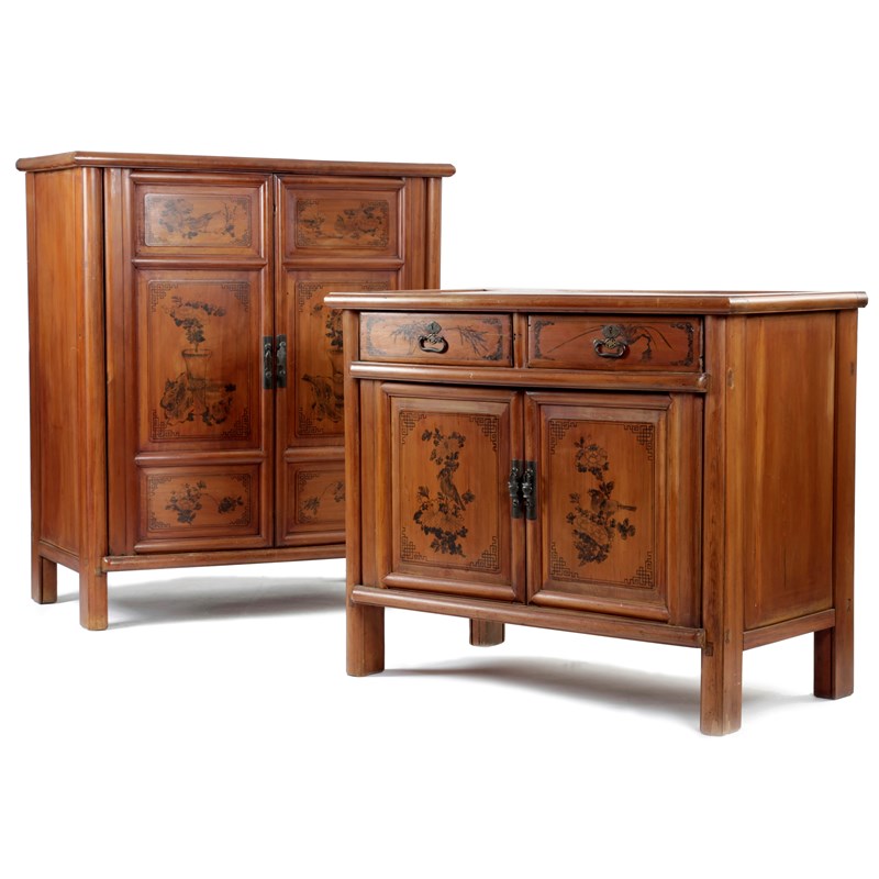 decorated in ink with panels of birds, vases of flowers and bamboo, one with a pair of panelled doors enclosing an interior with a shelf and two drawers, the other with a pair of drawers above a cupboard (2)