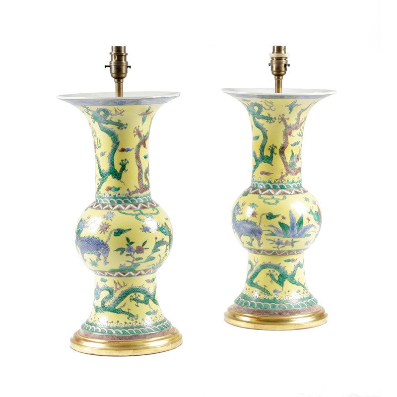 each of gu shape, each with a yellow ground and painted with dragons chasing a pearl, on a giltwood base, with shades and fitted for electricity (4)