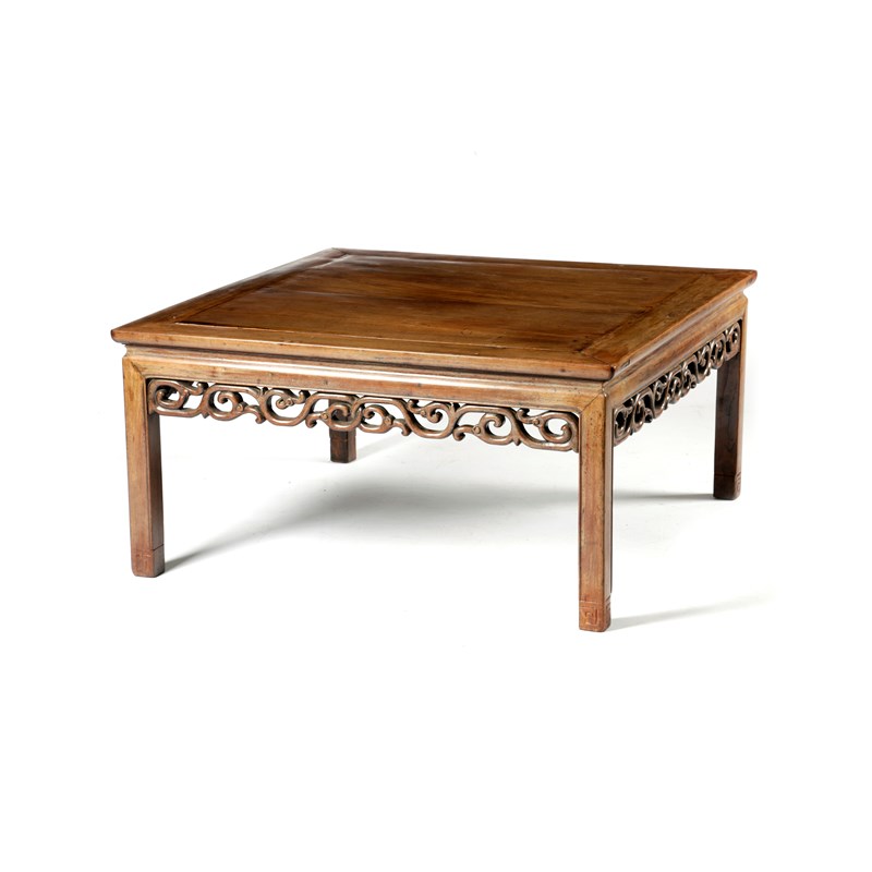 the panelled top above a plain frieze and a pierced and carved apron of interlocking stylised bird's heads