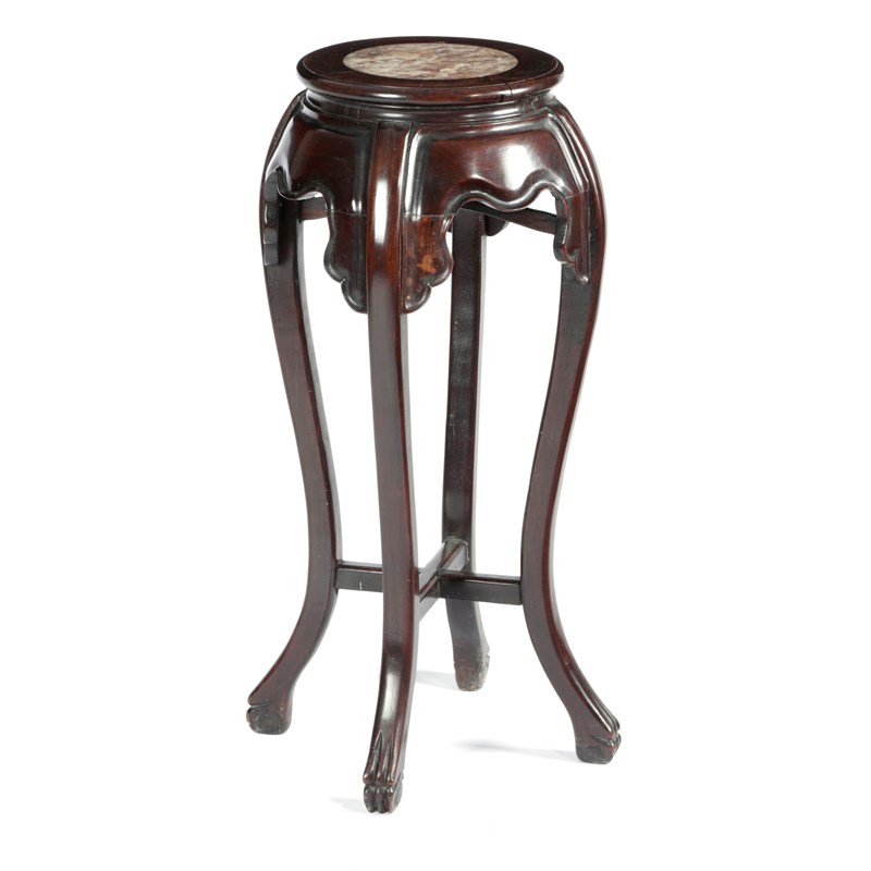 the circular inset marble top above a shaped frieze and cabriole legs united by an 'X' stretcher
