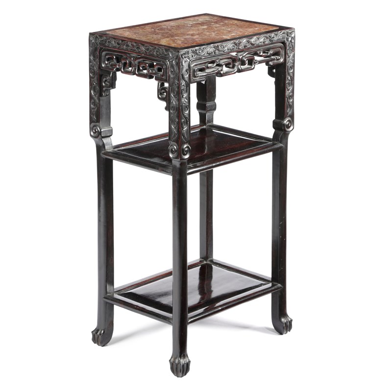 the top inset with a marble panel, carved with leaves and flowers and with pierced friezes on stylised paw feet